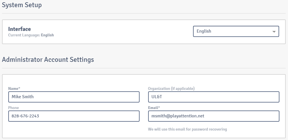 Fill in the fields with the appropriate information and then press <Done>. Play Attention will attempt to send the Primary Account an email. If the email is sent successfully then you are sent to the System Settings screen.