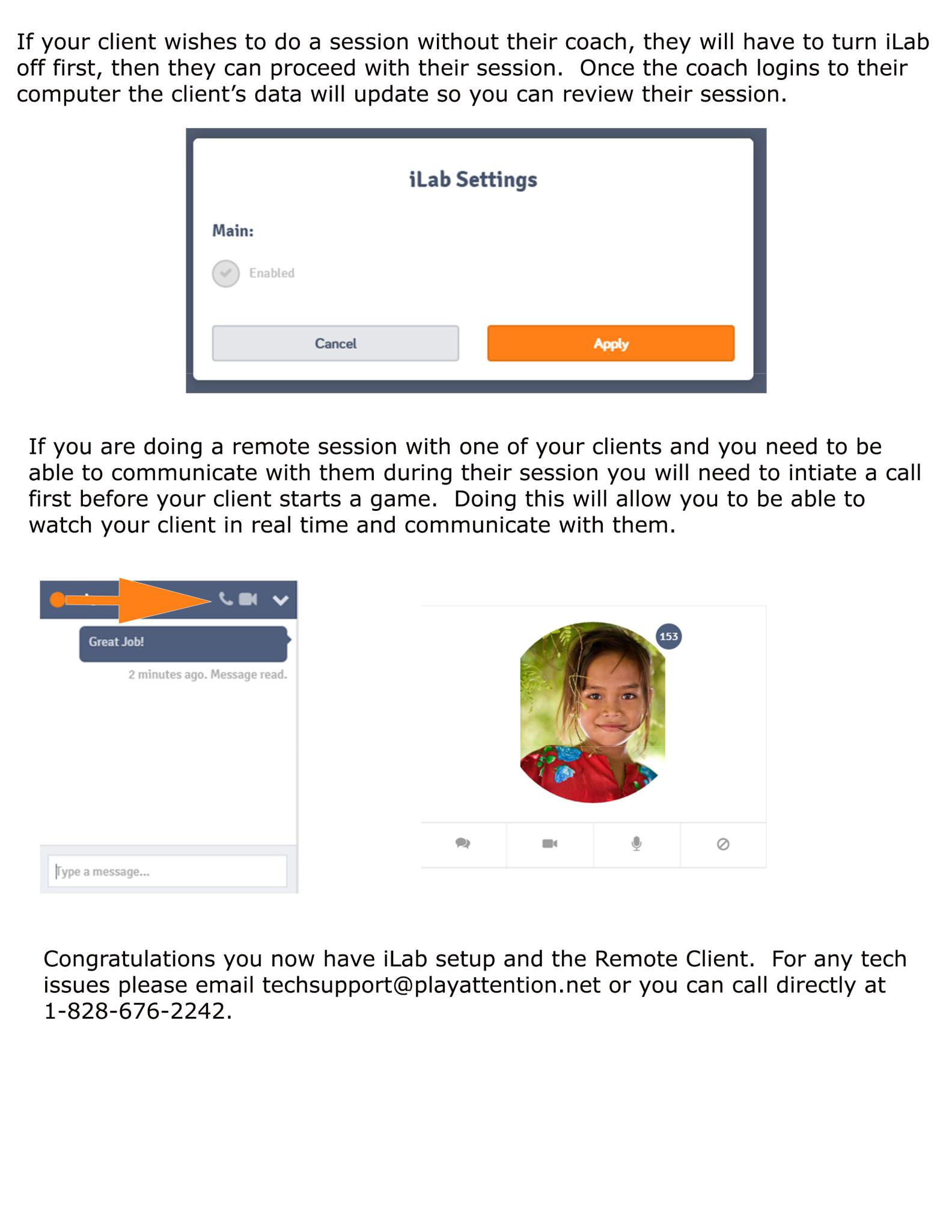 When you client logs in they will do their session and you will be able to coach them remotely. All of the iLab features are the same.